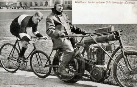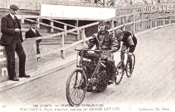 In 1899, Bobby entered another critical phase of his professional career. He was introduced to the motorcycle. Most racing then was behind pacing machines, with anywhere from two to five riders pedaling, and Bobby had established himself as an exceptionally good stayer, as the racer following was called. The advent of the motorcycle made it much easier to attain the speeds which are possible when tucked in behind a draft. Motor-paced racing began in England in 1895 and Bobby discovered it up north, to where it had naturally migrated. He brought it down south with him in the fall when he returned for one of his visits to race before the home crowd. He purchased a motor tandem from the Orient Cycle Company in Waltham, Mass. to use in the races. It was a huge machine weighing nearly 300 pounds and geared to 170 inches. With each turn of the cranks it would travel half a block. It was the first motorized machine in the state of Georgia. The purpose of being a tandem was so that one man could steer while the other would operate the motor. To say that it created wild enthusiasm is an understatement. It was a mind boggling thing to the people of 1899. It was as loud as a locomotive and ran at a speed difficult to comprehend for them. The three machines used in the races had nicknames which give a good idea of what people thought about them: the "Infernal Machine", the "Go Devil", and the "Devil Catcher". The races were originally scheduled to be held on the dirt track at Piedmont Park, but because of heavy rain they were moved indoors to the Coliseum. The sight of two motorcycles followed by bicycle riders whirling around a sixth of a mile indoor board track in excess of thirty miles an hour must have been stunning. Add to this the deafening noise and you get quite a picture. Bobby rode against Jay Eaton, the "Indoor King", but lost in a closely fought race. All in all, it was an exciting weekend and an important historical interlude in the life of the city of Atlanta.